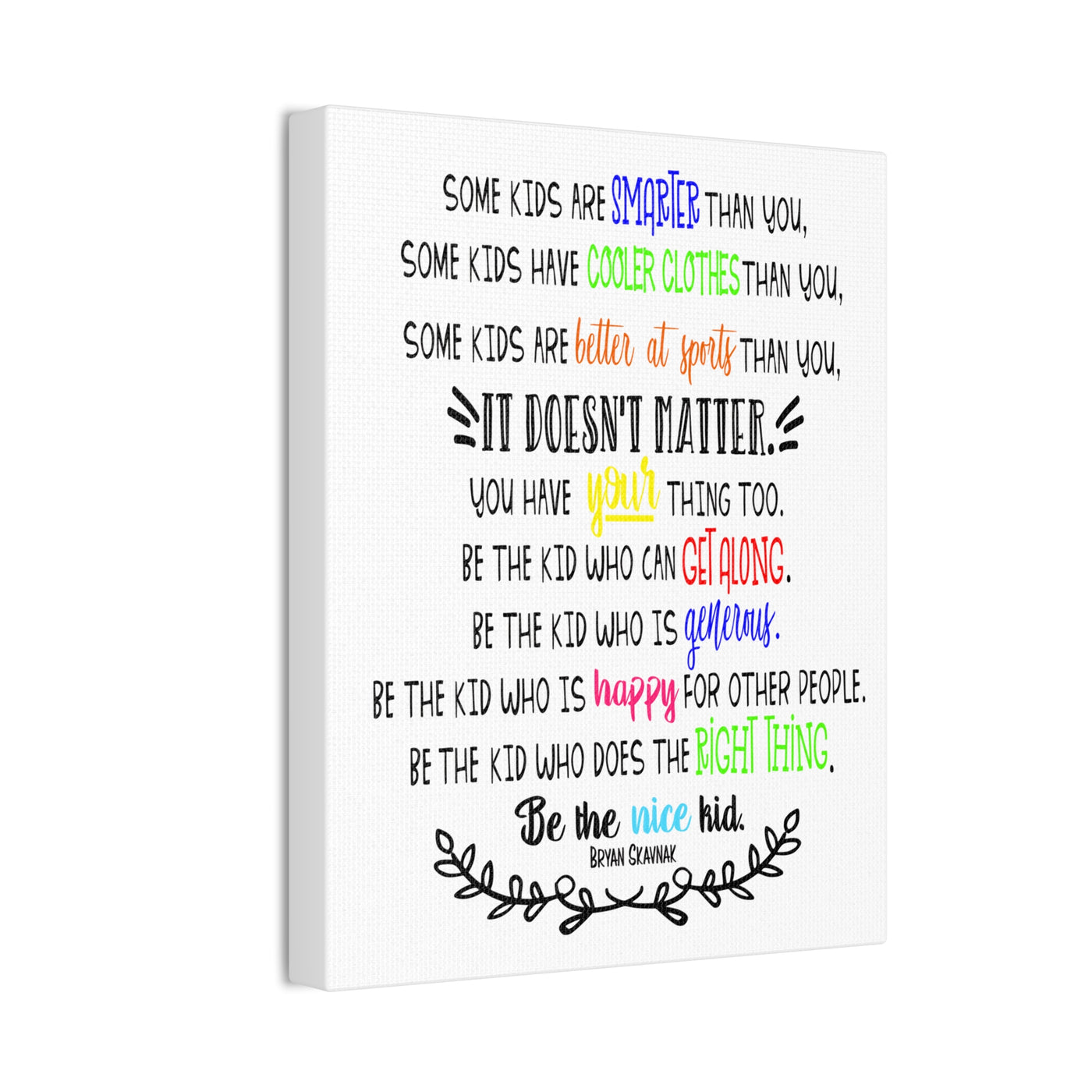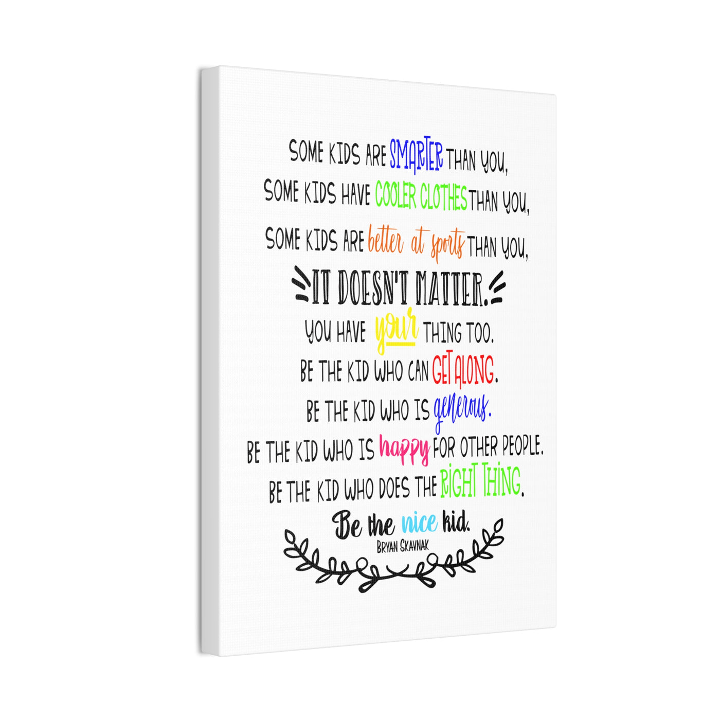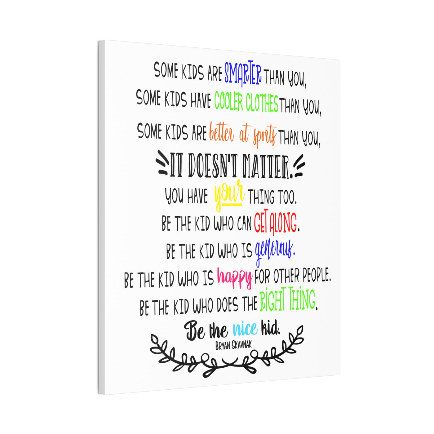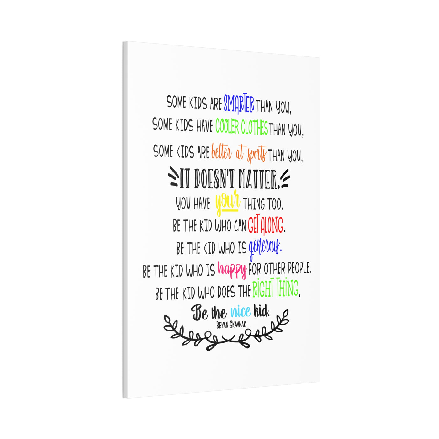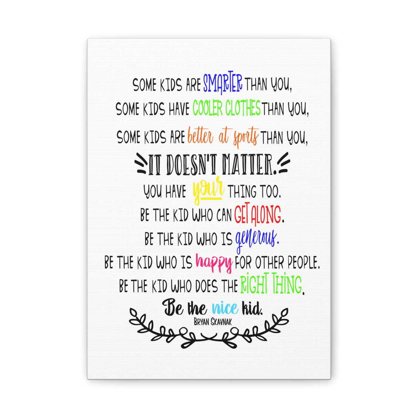 {"id":9047701258479,"title":"Be the nice kid wall art CANVAS poster","handle":"be-the-nice-kid-wall-art-canvas","description":"\u003cp\u003eDESCRIPTION: Wall art canvas of the quote: \"Some kids are SMARTER than you. Some kids have COOLER CLOTHES than you. Some kids are BETTER AT SPORTS than you. IT DOESN'T MATTER You have YOUR thing too. Be the kid who can GET ALONG. Be the kid who is GENEROUS. Be the kid who is HAPPY for other people. Be the kid who does the RIGHT THING. Be the NICE KID.\" -Bryan Skavnak Sold with permission from the author Bryan Skavnak GREAT wall art print for a classroom, reading nook, teacher desk area, school library, reading room or classroom hallway welcome display. This would also be great for a school office area or any Counselor's office. A perfect addition to every room! Our standard canvas is a finely textured artist-grade cotton substrate which consistently reproduces image details with outstanding clarity and detail. .: 100% Cotton fabric .: Wooden frame .: High image quality and detail .: For indoor use\u003c\/p\u003e\n\u003ctable id=\"size-guide\" style=\"min-width: 360px;\"\u003e\n\u003cthead\u003e\n\u003ctr\u003e\n\u003cth style=\"padding: 10px;\"\u003e \u003c\/th\u003e\n\u003cth style=\"color: #000000; font-weight: 500; text-align: left; font-size: 15px; padding: 10px;\"\u003e8″ x 10″ (Vertical)\u003c\/th\u003e\n\u003cth style=\"color: #000000; font-weight: 500; text-align: left; font-size: 15px; padding: 10px;\"\u003e10'' x 14'' (Vertical)\u003c\/th\u003e\n\u003cth style=\"color: #000000; font-weight: 500; text-align: left; font-size: 15px; padding: 10px;\"\u003e16\" x 20\" (Vertical)\u003c\/th\u003e\n\u003cth style=\"color: #000000; font-weight: 500; text-align: left; font-size: 15px; padding: 10px;\"\u003e20\" x 24\" (Vertical)\u003c\/th\u003e\n\u003cth style=\"color: #000000; font-weight: 500; text-align: left; font-size: 15px; padding: 10px;\"\u003e24\" x 36\" (Vertical)\u003c\/th\u003e\n\u003c\/tr\u003e\n\u003c\/thead\u003e\n\u003ctbody\u003e\n\u003ctr\u003e\n\u003ctd style=\"padding: 10px; color: #525252; font-size: 15px; border-top: 1px solid #ededed; word-break: break-word;\"\u003eWidth, in\u003c\/td\u003e\n\u003ctd style=\"padding: 10px; color: #525252; font-size: 15px; border-top: 1px solid #ededed; word-break: break-word;\"\u003e7.91\u003c\/td\u003e\n\u003ctd style=\"padding: 10px; color: #525252; font-size: 15px; border-top: 1px solid #ededed; word-break: break-word;\"\u003e9.88\u003c\/td\u003e\n\u003ctd style=\"padding: 10px; color: #525252; font-size: 15px; border-top: 1px solid #ededed; word-break: break-word;\"\u003e15.79\u003c\/td\u003e\n\u003ctd style=\"padding: 10px; color: #525252; font-size: 15px; border-top: 1px solid #ededed; word-break: break-word;\"\u003e19.76\u003c\/td\u003e\n\u003ctd style=\"padding: 10px; color: #525252; font-size: 15px; border-top: 1px solid #ededed; word-break: break-word;\"\u003e23.70\u003c\/td\u003e\n\u003c\/tr\u003e\n\u003ctr\u003e\n\u003ctd style=\"padding: 10px; color: #525252; font-size: 15px; border-top: 1px solid #ededed; word-break: break-word;\"\u003eHeight, in\u003c\/td\u003e\n\u003ctd style=\"padding: 10px; color: #525252; font-size: 15px; border-top: 1px solid #ededed; word-break: break-word;\"\u003e9.88\u003c\/td\u003e\n\u003ctd style=\"padding: 10px; color: #525252; font-size: 15px; border-top: 1px solid #ededed; word-break: break-word;\"\u003e13.82\u003c\/td\u003e\n\u003ctd style=\"padding: 10px; color: #525252; font-size: 15px; border-top: 1px solid #ededed; word-break: break-word;\"\u003e19.76\u003c\/td\u003e\n\u003ctd style=\"padding: 10px; color: #525252; font-size: 15px; border-top: 1px solid #ededed; word-break: break-word;\"\u003e23.70\u003c\/td\u003e\n\u003ctd style=\"padding: 10px; color: #525252; font-size: 15px; border-top: 1px solid #ededed; word-break: break-word;\"\u003e35.55\u003c\/td\u003e\n\u003c\/tr\u003e\n\u003ctr\u003e\n\u003ctd style=\"padding: 10px; color: #525252; font-size: 15px; border-top: 1px solid #ededed; word-break: break-word;\"\u003eDepth, in\u003c\/td\u003e\n\u003ctd style=\"padding: 10px; color: #525252; font-size: 15px; border-top: 1px solid #ededed; word-break: break-word;\"\u003e0.75\u003c\/td\u003e\n\u003ctd style=\"padding: 10px; color: #525252; font-size: 15px; border-top: 1px solid #ededed; word-break: break-word;\"\u003e0.75\u003c\/td\u003e\n\u003ctd style=\"padding: 10px; color: #525252; font-size: 15px; border-top: 1px solid #ededed; word-break: break-word;\"\u003e0.75\u003c\/td\u003e\n\u003ctd style=\"padding: 10px; color: #525252; font-size: 15px; border-top: 1px solid #ededed; word-break: break-word;\"\u003e0.75\u003c\/td\u003e\n\u003ctd style=\"padding: 10px; color: #525252; font-size: 15px; border-top: 1px solid #ededed; word-break: break-word;\"\u003e0.75\u003c\/td\u003e\n\u003c\/tr\u003e\n\u003c\/tbody\u003e\n\u003c\/table\u003e\n\u003cp\u003e \u003c\/p\u003e","published_at":"2025-08-29T08:39:59-05:00","created_at":"2025-08-29T08:39:42-05:00","vendor":"Printify","type":"Canvas","tags":["Art \u0026 Wall Decor","back to school","canvas","classroom","classroom decor","Hanging Hardware","Home \u0026 Living","home poster","home print","Indoor","school poster"],"price":2200,"price_min":2200,"price_max":9200,"available":true,"price_varies":true,"compare_at_price":null,"compare_at_price_min":0,"compare_at_price_max":0,"compare_at_price_varies":false,"variants":[{"id":46800391962863,"title":"8″ x 10″ (Vertical) \/ 0.75''","option1":"8″ x 10″ (Vertical)","option2":"0.75''","option3":null,"sku":"12469938296228234516","requires_shipping":true,"taxable":true,"featured_image":{"id":45140897169647,"product_id":9047701258479,"position":1,"created_at":"2025-08-29T08:40:16-05:00","updated_at":"2025-08-29T08:40:18-05:00","alt":null,"width":2048,"height":2048,"src":"\/\/theartsyspot.com\/cdn\/shop\/files\/3110154547276920620_2048.jpg?v=1756474818","variant_ids":[46800391962863]},"available":true,"name":"Be the nice kid wall art CANVAS poster - 8