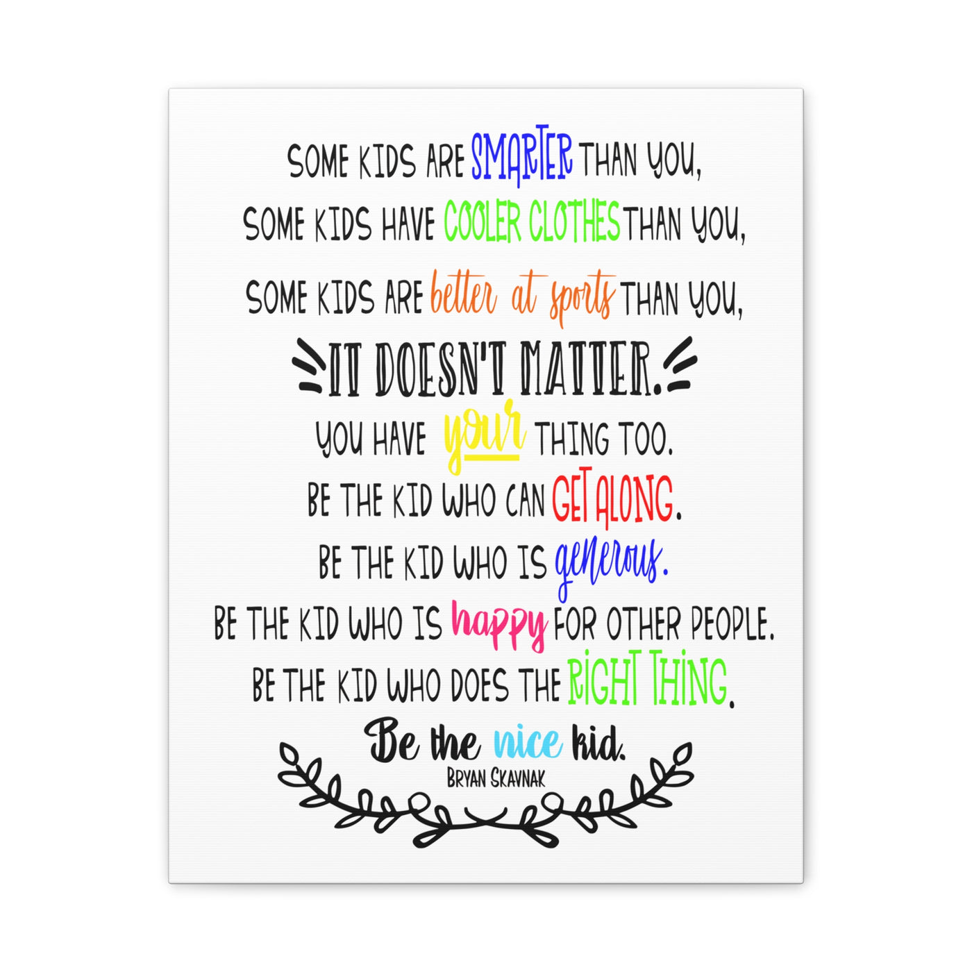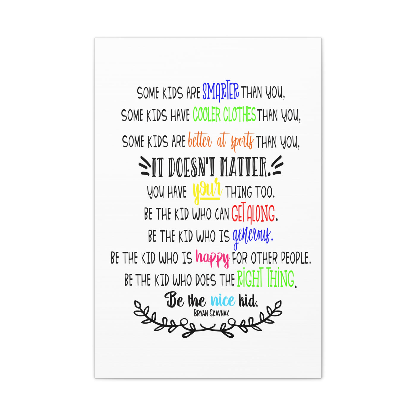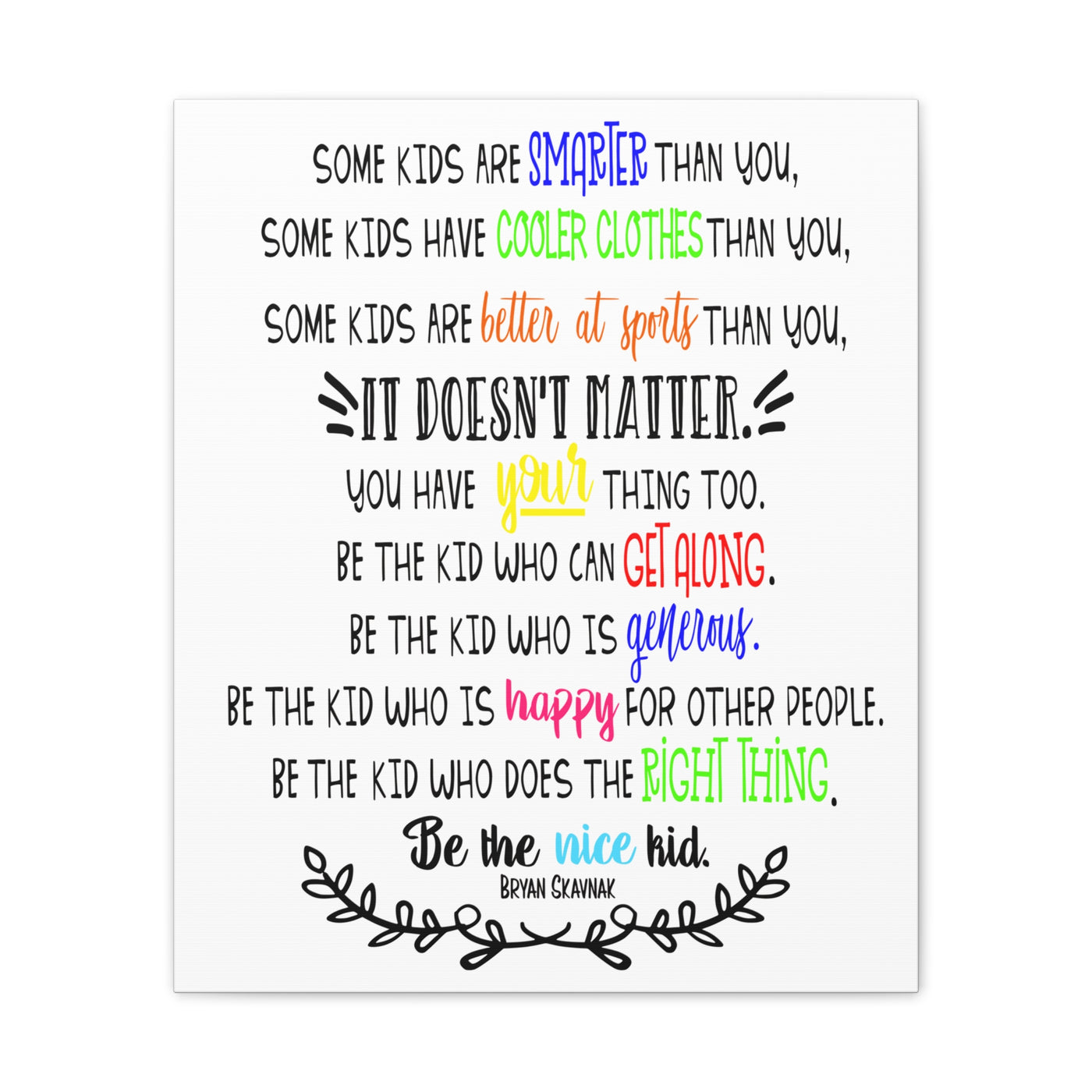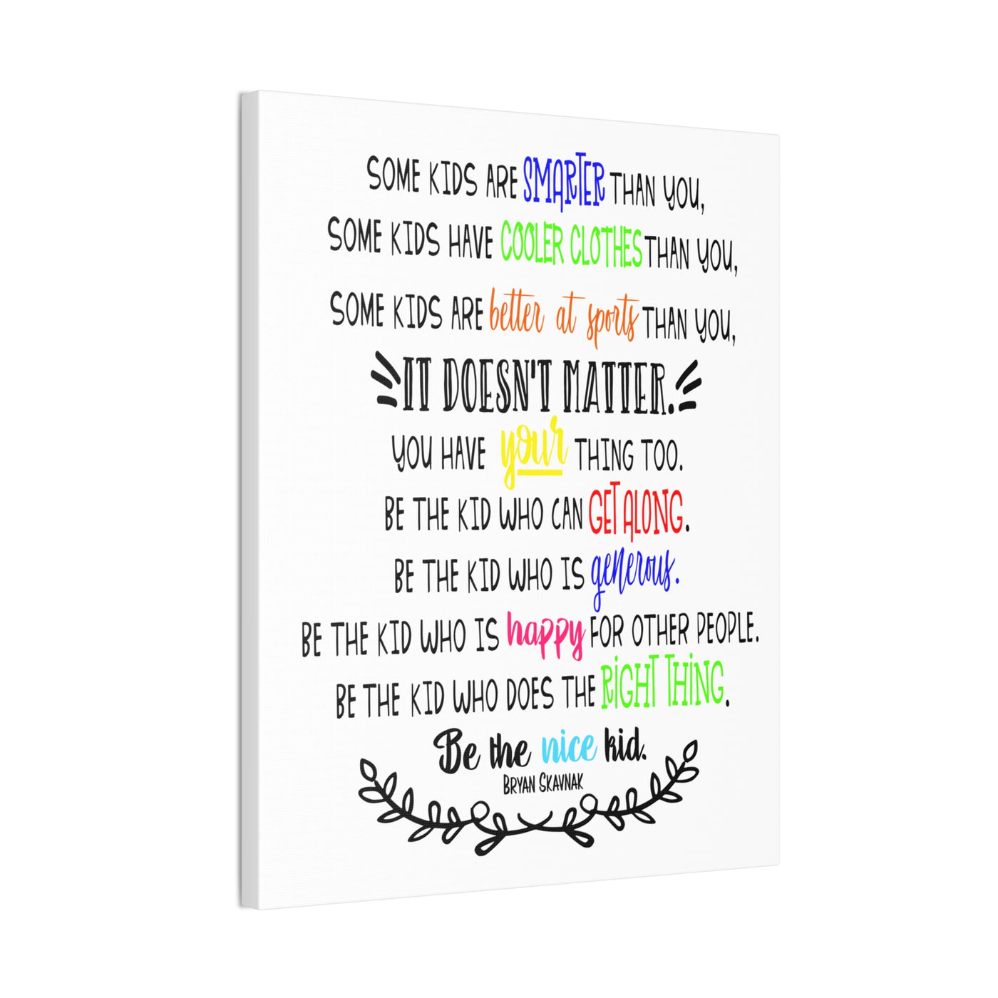 {"id":9047701258479,"title":"Be the nice kid wall art CANVAS poster","handle":"be-the-nice-kid-wall-art-canvas","description":"\u003cp\u003eDESCRIPTION: Wall art canvas of the quote: \"Some kids are SMARTER than you. Some kids have COOLER CLOTHES than you. Some kids are BETTER AT SPORTS than you. IT DOESN'T MATTER You have YOUR thing too. Be the kid who can GET ALONG. Be the kid who is GENEROUS. Be the kid who is HAPPY for other people. Be the kid who does the RIGHT THING. Be the NICE KID.\" -Bryan Skavnak Sold with permission from the author Bryan Skavnak GREAT wall art print for a classroom, reading nook, teacher desk area, school library, reading room or classroom hallway welcome display. This would also be great for a school office area or any Counselor's office. A perfect addition to every room! Our standard canvas is a finely textured artist-grade cotton substrate which consistently reproduces image details with outstanding clarity and detail. .: 100% Cotton fabric .: Wooden frame .: High image quality and detail .: For indoor use\u003c\/p\u003e\n\u003ctable id=\"size-guide\" style=\"min-width: 360px;\"\u003e\n\u003cthead\u003e\n\u003ctr\u003e\n\u003cth style=\"padding: 10px;\"\u003e \u003c\/th\u003e\n\u003cth style=\"color: #000000; font-weight: 500; text-align: left; font-size: 15px; padding: 10px;\"\u003e8″ x 10″ (Vertical)\u003c\/th\u003e\n\u003cth style=\"color: #000000; font-weight: 500; text-align: left; font-size: 15px; padding: 10px;\"\u003e10'' x 14'' (Vertical)\u003c\/th\u003e\n\u003cth style=\"color: #000000; font-weight: 500; text-align: left; font-size: 15px; padding: 10px;\"\u003e16\" x 20\" (Vertical)\u003c\/th\u003e\n\u003cth style=\"color: #000000; font-weight: 500; text-align: left; font-size: 15px; padding: 10px;\"\u003e20\" x 24\" (Vertical)\u003c\/th\u003e\n\u003cth style=\"color: #000000; font-weight: 500; text-align: left; font-size: 15px; padding: 10px;\"\u003e24\" x 36\" (Vertical)\u003c\/th\u003e\n\u003c\/tr\u003e\n\u003c\/thead\u003e\n\u003ctbody\u003e\n\u003ctr\u003e\n\u003ctd style=\"padding: 10px; color: #525252; font-size: 15px; border-top: 1px solid #ededed; word-break: break-word;\"\u003eWidth, in\u003c\/td\u003e\n\u003ctd style=\"padding: 10px; color: #525252; font-size: 15px; border-top: 1px solid #ededed; word-break: break-word;\"\u003e7.91\u003c\/td\u003e\n\u003ctd style=\"padding: 10px; color: #525252; font-size: 15px; border-top: 1px solid #ededed; word-break: break-word;\"\u003e9.88\u003c\/td\u003e\n\u003ctd style=\"padding: 10px; color: #525252; font-size: 15px; border-top: 1px solid #ededed; word-break: break-word;\"\u003e15.79\u003c\/td\u003e\n\u003ctd style=\"padding: 10px; color: #525252; font-size: 15px; border-top: 1px solid #ededed; word-break: break-word;\"\u003e19.76\u003c\/td\u003e\n\u003ctd style=\"padding: 10px; color: #525252; font-size: 15px; border-top: 1px solid #ededed; word-break: break-word;\"\u003e23.70\u003c\/td\u003e\n\u003c\/tr\u003e\n\u003ctr\u003e\n\u003ctd style=\"padding: 10px; color: #525252; font-size: 15px; border-top: 1px solid #ededed; word-break: break-word;\"\u003eHeight, in\u003c\/td\u003e\n\u003ctd style=\"padding: 10px; color: #525252; font-size: 15px; border-top: 1px solid #ededed; word-break: break-word;\"\u003e9.88\u003c\/td\u003e\n\u003ctd style=\"padding: 10px; color: #525252; font-size: 15px; border-top: 1px solid #ededed; word-break: break-word;\"\u003e13.82\u003c\/td\u003e\n\u003ctd style=\"padding: 10px; color: #525252; font-size: 15px; border-top: 1px solid #ededed; word-break: break-word;\"\u003e19.76\u003c\/td\u003e\n\u003ctd style=\"padding: 10px; color: #525252; font-size: 15px; border-top: 1px solid #ededed; word-break: break-word;\"\u003e23.70\u003c\/td\u003e\n\u003ctd style=\"padding: 10px; color: #525252; font-size: 15px; border-top: 1px solid #ededed; word-break: break-word;\"\u003e35.55\u003c\/td\u003e\n\u003c\/tr\u003e\n\u003ctr\u003e\n\u003ctd style=\"padding: 10px; color: #525252; font-size: 15px; border-top: 1px solid #ededed; word-break: break-word;\"\u003eDepth, in\u003c\/td\u003e\n\u003ctd style=\"padding: 10px; color: #525252; font-size: 15px; border-top: 1px solid #ededed; word-break: break-word;\"\u003e0.75\u003c\/td\u003e\n\u003ctd style=\"padding: 10px; color: #525252; font-size: 15px; border-top: 1px solid #ededed; word-break: break-word;\"\u003e0.75\u003c\/td\u003e\n\u003ctd style=\"padding: 10px; color: #525252; font-size: 15px; border-top: 1px solid #ededed; word-break: break-word;\"\u003e0.75\u003c\/td\u003e\n\u003ctd style=\"padding: 10px; color: #525252; font-size: 15px; border-top: 1px solid #ededed; word-break: break-word;\"\u003e0.75\u003c\/td\u003e\n\u003ctd style=\"padding: 10px; color: #525252; font-size: 15px; border-top: 1px solid #ededed; word-break: break-word;\"\u003e0.75\u003c\/td\u003e\n\u003c\/tr\u003e\n\u003c\/tbody\u003e\n\u003c\/table\u003e\n\u003cp\u003e \u003c\/p\u003e","published_at":"2025-08-29T08:39:59-05:00","created_at":"2025-08-29T08:39:42-05:00","vendor":"Printify","type":"Canvas","tags":["Art \u0026 Wall Decor","back to school","canvas","classroom","classroom decor","Hanging Hardware","Home \u0026 Living","home poster","home print","Indoor","school poster"],"price":2200,"price_min":2200,"price_max":9200,"available":true,"price_varies":true,"compare_at_price":null,"compare_at_price_min":0,"compare_at_price_max":0,"compare_at_price_varies":false,"variants":[{"id":46800391962863,"title":"8″ x 10″ (Vertical) \/ 0.75''","option1":"8″ x 10″ (Vertical)","option2":"0.75''","option3":null,"sku":"12469938296228234516","requires_shipping":true,"taxable":true,"featured_image":{"id":45140897169647,"product_id":9047701258479,"position":1,"created_at":"2025-08-29T08:40:16-05:00","updated_at":"2025-08-29T08:40:18-05:00","alt":null,"width":2048,"height":2048,"src":"\/\/theartsyspot.com\/cdn\/shop\/files\/3110154547276920620_2048.jpg?v=1756474818","variant_ids":[46800391962863]},"available":true,"name":"Be the nice kid wall art CANVAS poster - 8
