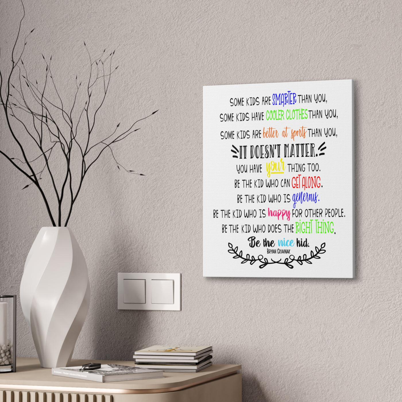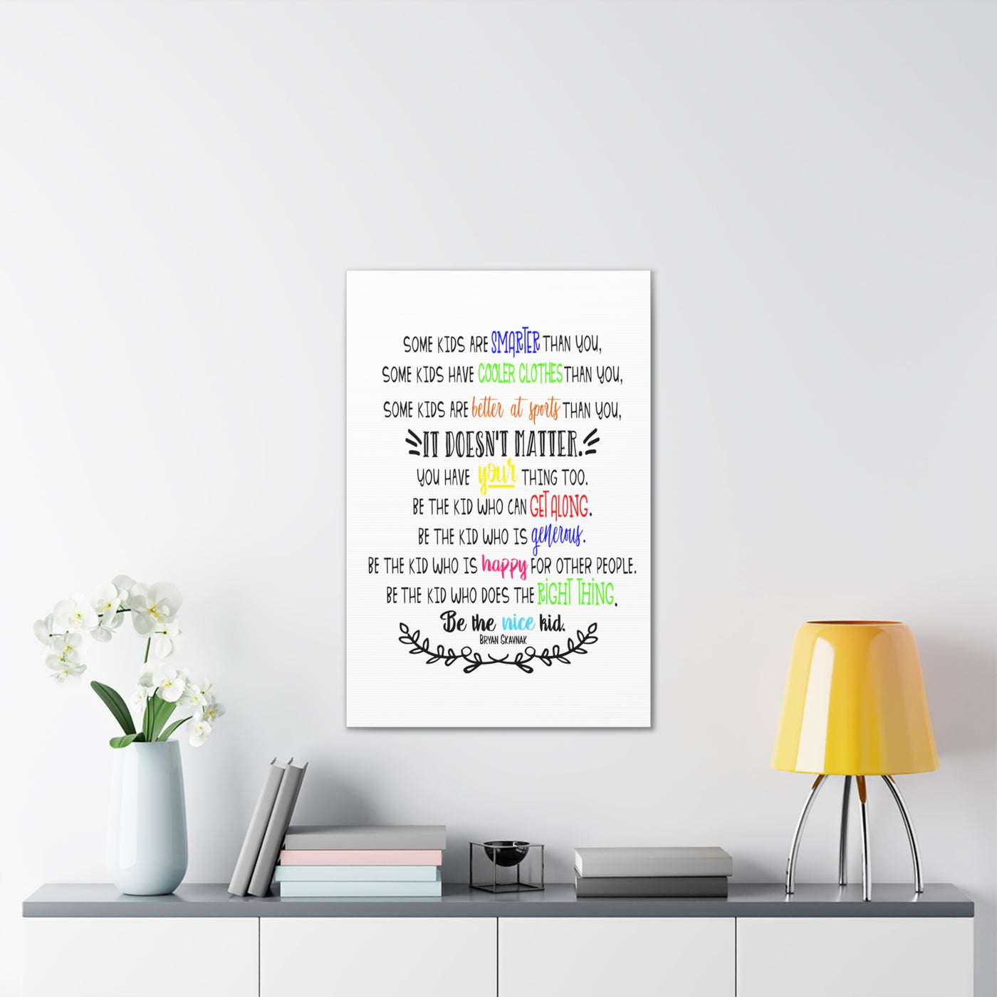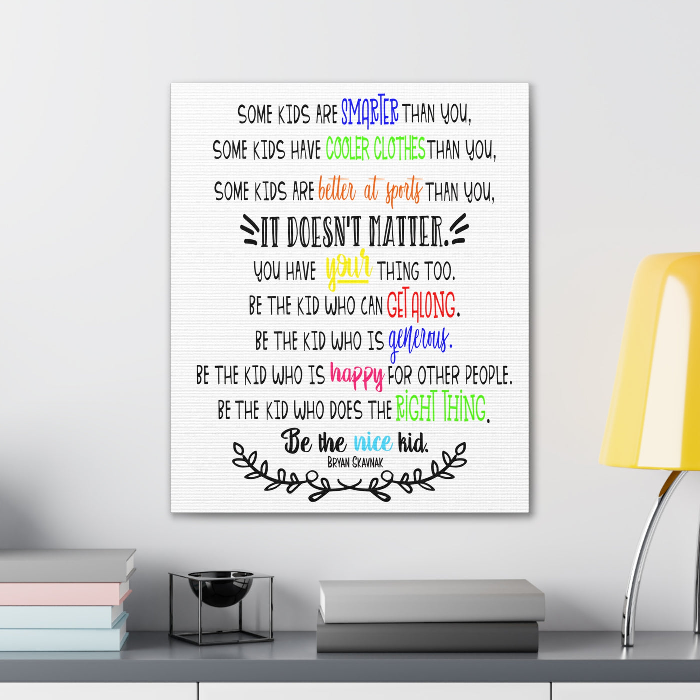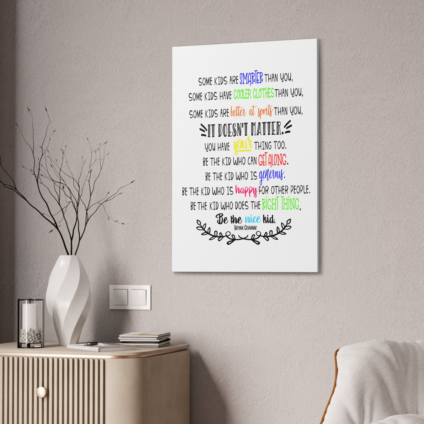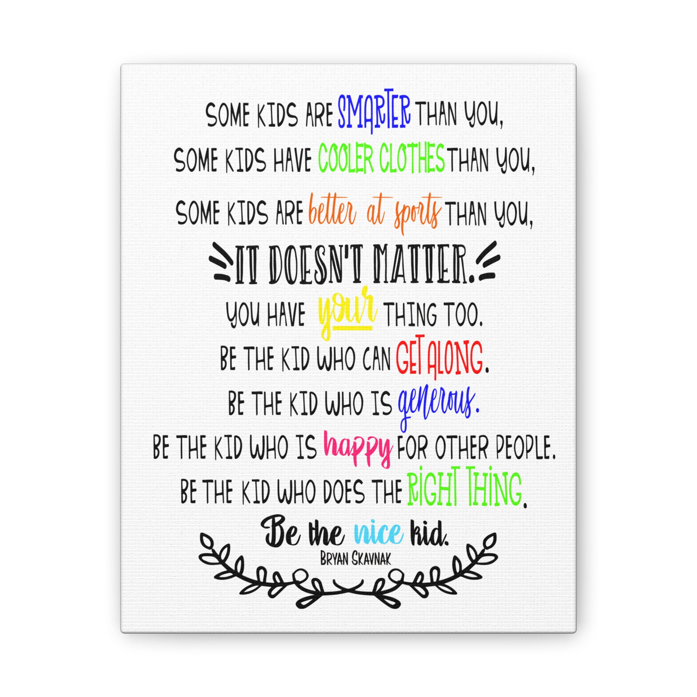 {"id":9047701258479,"title":"Be the nice kid wall art CANVAS poster","handle":"be-the-nice-kid-wall-art-canvas","description":"\u003cp\u003eDESCRIPTION: Wall art canvas of the quote: \"Some kids are SMARTER than you. Some kids have COOLER CLOTHES than you. Some kids are BETTER AT SPORTS than you. IT DOESN'T MATTER You have YOUR thing too. Be the kid who can GET ALONG. Be the kid who is GENEROUS. Be the kid who is HAPPY for other people. Be the kid who does the RIGHT THING. Be the NICE KID.\" -Bryan Skavnak Sold with permission from the author Bryan Skavnak GREAT wall art print for a classroom, reading nook, teacher desk area, school library, reading room or classroom hallway welcome display. This would also be great for a school office area or any Counselor's office. A perfect addition to every room! Our standard canvas is a finely textured artist-grade cotton substrate which consistently reproduces image details with outstanding clarity and detail. .: 100% Cotton fabric .: Wooden frame .: High image quality and detail .: For indoor use\u003c\/p\u003e\n\u003ctable id=\"size-guide\" style=\"min-width: 360px;\"\u003e\n\u003cthead\u003e\n\u003ctr\u003e\n\u003cth style=\"padding: 10px;\"\u003e \u003c\/th\u003e\n\u003cth style=\"color: #000000; font-weight: 500; text-align: left; font-size: 15px; padding: 10px;\"\u003e8″ x 10″ (Vertical)\u003c\/th\u003e\n\u003cth style=\"color: #000000; font-weight: 500; text-align: left; font-size: 15px; padding: 10px;\"\u003e10'' x 14'' (Vertical)\u003c\/th\u003e\n\u003cth style=\"color: #000000; font-weight: 500; text-align: left; font-size: 15px; padding: 10px;\"\u003e16\" x 20\" (Vertical)\u003c\/th\u003e\n\u003cth style=\"color: #000000; font-weight: 500; text-align: left; font-size: 15px; padding: 10px;\"\u003e20\" x 24\" (Vertical)\u003c\/th\u003e\n\u003cth style=\"color: #000000; font-weight: 500; text-align: left; font-size: 15px; padding: 10px;\"\u003e24\" x 36\" (Vertical)\u003c\/th\u003e\n\u003c\/tr\u003e\n\u003c\/thead\u003e\n\u003ctbody\u003e\n\u003ctr\u003e\n\u003ctd style=\"padding: 10px; color: #525252; font-size: 15px; border-top: 1px solid #ededed; word-break: break-word;\"\u003eWidth, in\u003c\/td\u003e\n\u003ctd style=\"padding: 10px; color: #525252; font-size: 15px; border-top: 1px solid #ededed; word-break: break-word;\"\u003e7.91\u003c\/td\u003e\n\u003ctd style=\"padding: 10px; color: #525252; font-size: 15px; border-top: 1px solid #ededed; word-break: break-word;\"\u003e9.88\u003c\/td\u003e\n\u003ctd style=\"padding: 10px; color: #525252; font-size: 15px; border-top: 1px solid #ededed; word-break: break-word;\"\u003e15.79\u003c\/td\u003e\n\u003ctd style=\"padding: 10px; color: #525252; font-size: 15px; border-top: 1px solid #ededed; word-break: break-word;\"\u003e19.76\u003c\/td\u003e\n\u003ctd style=\"padding: 10px; color: #525252; font-size: 15px; border-top: 1px solid #ededed; word-break: break-word;\"\u003e23.70\u003c\/td\u003e\n\u003c\/tr\u003e\n\u003ctr\u003e\n\u003ctd style=\"padding: 10px; color: #525252; font-size: 15px; border-top: 1px solid #ededed; word-break: break-word;\"\u003eHeight, in\u003c\/td\u003e\n\u003ctd style=\"padding: 10px; color: #525252; font-size: 15px; border-top: 1px solid #ededed; word-break: break-word;\"\u003e9.88\u003c\/td\u003e\n\u003ctd style=\"padding: 10px; color: #525252; font-size: 15px; border-top: 1px solid #ededed; word-break: break-word;\"\u003e13.82\u003c\/td\u003e\n\u003ctd style=\"padding: 10px; color: #525252; font-size: 15px; border-top: 1px solid #ededed; word-break: break-word;\"\u003e19.76\u003c\/td\u003e\n\u003ctd style=\"padding: 10px; color: #525252; font-size: 15px; border-top: 1px solid #ededed; word-break: break-word;\"\u003e23.70\u003c\/td\u003e\n\u003ctd style=\"padding: 10px; color: #525252; font-size: 15px; border-top: 1px solid #ededed; word-break: break-word;\"\u003e35.55\u003c\/td\u003e\n\u003c\/tr\u003e\n\u003ctr\u003e\n\u003ctd style=\"padding: 10px; color: #525252; font-size: 15px; border-top: 1px solid #ededed; word-break: break-word;\"\u003eDepth, in\u003c\/td\u003e\n\u003ctd style=\"padding: 10px; color: #525252; font-size: 15px; border-top: 1px solid #ededed; word-break: break-word;\"\u003e0.75\u003c\/td\u003e\n\u003ctd style=\"padding: 10px; color: #525252; font-size: 15px; border-top: 1px solid #ededed; word-break: break-word;\"\u003e0.75\u003c\/td\u003e\n\u003ctd style=\"padding: 10px; color: #525252; font-size: 15px; border-top: 1px solid #ededed; word-break: break-word;\"\u003e0.75\u003c\/td\u003e\n\u003ctd style=\"padding: 10px; color: #525252; font-size: 15px; border-top: 1px solid #ededed; word-break: break-word;\"\u003e0.75\u003c\/td\u003e\n\u003ctd style=\"padding: 10px; color: #525252; font-size: 15px; border-top: 1px solid #ededed; word-break: break-word;\"\u003e0.75\u003c\/td\u003e\n\u003c\/tr\u003e\n\u003c\/tbody\u003e\n\u003c\/table\u003e\n\u003cp\u003e \u003c\/p\u003e","published_at":"2025-08-29T08:39:59-05:00","created_at":"2025-08-29T08:39:42-05:00","vendor":"Printify","type":"Canvas","tags":["Art \u0026 Wall Decor","back to school","canvas","classroom","classroom decor","Hanging Hardware","Home \u0026 Living","home poster","home print","Indoor","school poster"],"price":2200,"price_min":2200,"price_max":9200,"available":true,"price_varies":true,"compare_at_price":null,"compare_at_price_min":0,"compare_at_price_max":0,"compare_at_price_varies":false,"variants":[{"id":46800391962863,"title":"8″ x 10″ (Vertical) \/ 0.75''","option1":"8″ x 10″ (Vertical)","option2":"0.75''","option3":null,"sku":"12469938296228234516","requires_shipping":true,"taxable":true,"featured_image":{"id":45140897169647,"product_id":9047701258479,"position":1,"created_at":"2025-08-29T08:40:16-05:00","updated_at":"2025-08-29T08:40:18-05:00","alt":null,"width":2048,"height":2048,"src":"\/\/theartsyspot.com\/cdn\/shop\/files\/3110154547276920620_2048.jpg?v=1756474818","variant_ids":[46800391962863]},"available":true,"name":"Be the nice kid wall art CANVAS poster - 8